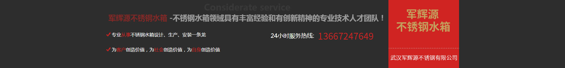 武漢軍輝源不銹鋼有限公司是華中地區(qū)專業(yè)生產(chǎn)不銹鋼水箱的環(huán)保企業(yè),公司集不銹鋼水箱開發(fā)設(shè)計、生產(chǎn)、銷售、維修、售后服務為一體。
